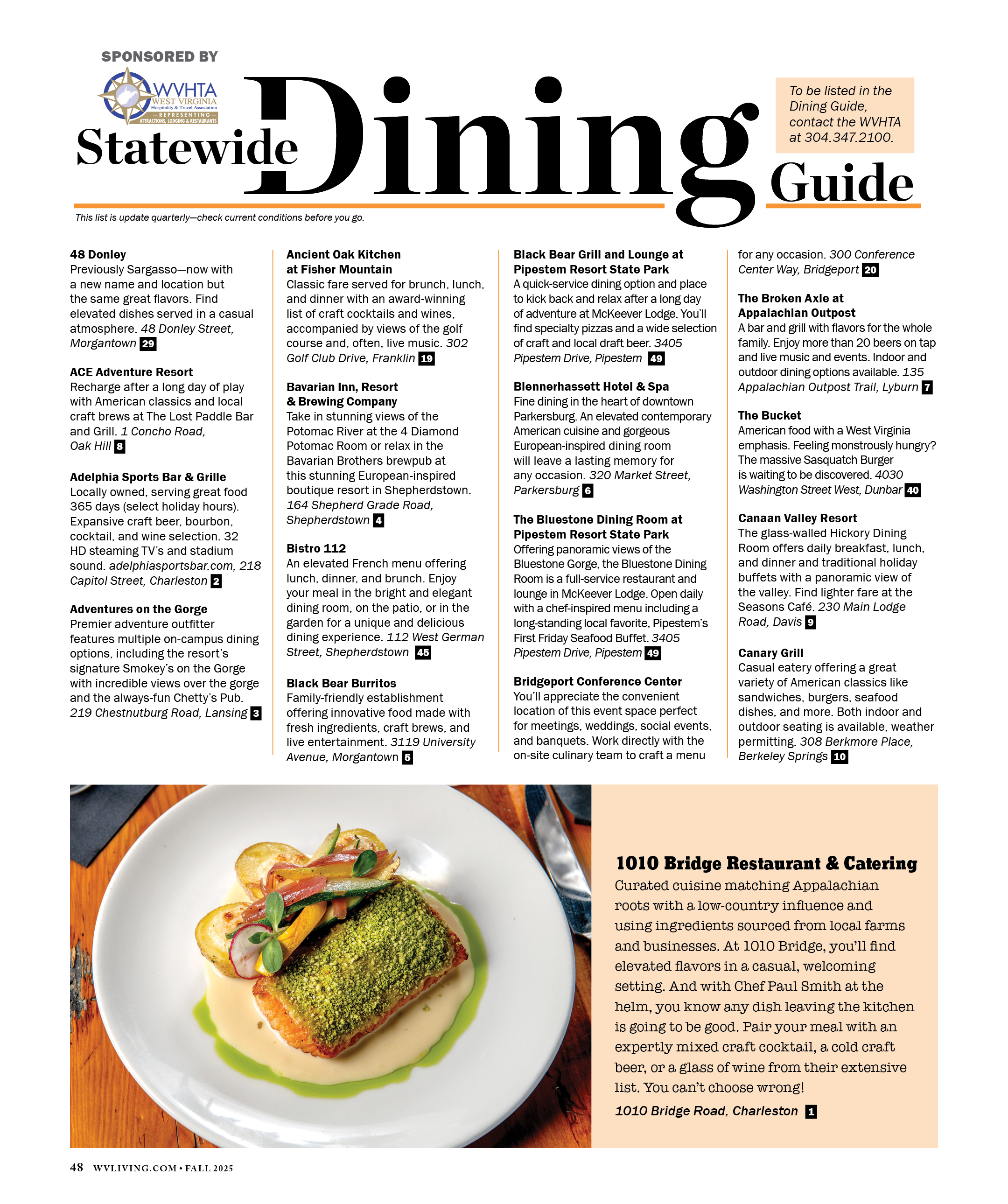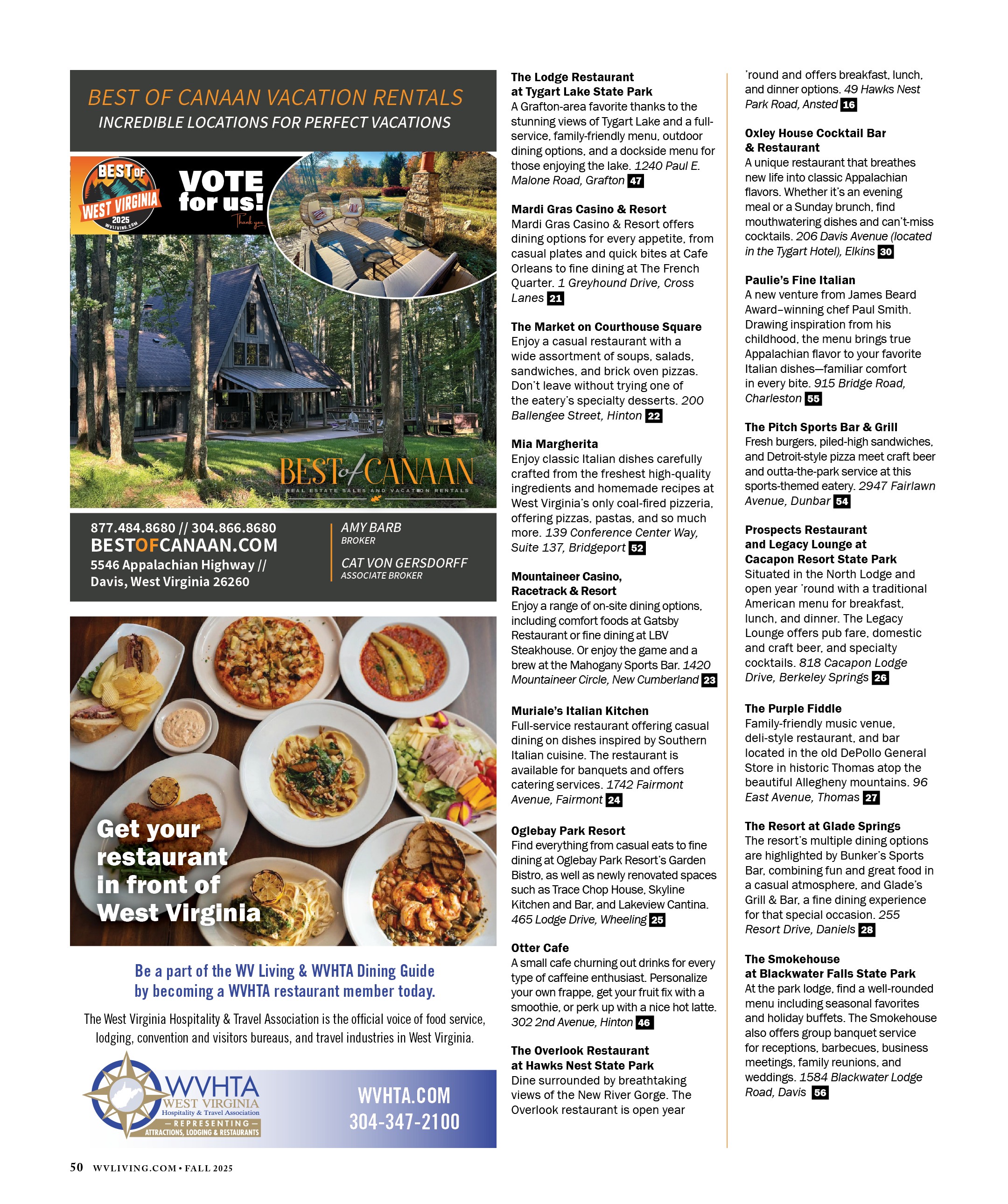 This is a great new benefit for our restaurant members to be featured in the WV Living Magazine that has 120,000 readers and is on newsstands across the state. You can check out the dining guide on pages 48-51 in the magazine. This new membership benefit is at no additional cost. WVHTA members are also eligible for special discounts on advertising separately in WV Living. If your restaurant or food service location would like to be featured in the next edition, give us a call at 304-347-2100 or email Jordan Nuzum at [email protected]. For membership forms click HERE.